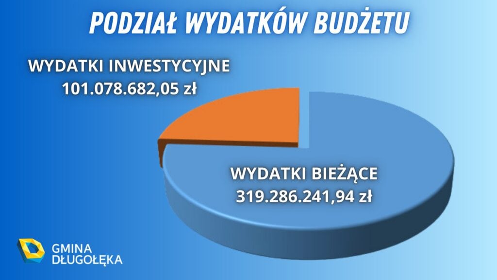 Wydatki budżetu w wysokości 420 364 924,00 zł zostaną przeznaczone na sfinansowanie wydatków bieżących w wysokości 319 286 241,95 zł, co stanowi 76% wszystkich wydatków oraz na sfinansowanie wydatków inwestycyjnych w wysokości 101 078 682,05 zł, co stanowi 24% wszystkich wydatków.