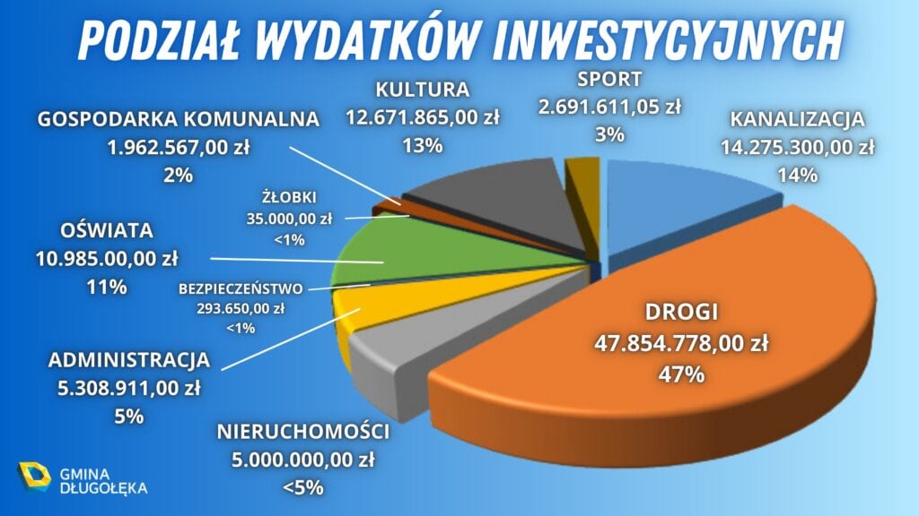 W ramach wydatków inwestycyjnych w wysokości 101 078 682,05 zł, największą kwotę przeznaczono na budowę dróg i chodników, zarówno przy drogach gminnych, jak i przy drogach powiatowych (47 854 778,00 zł), co stanowi aż 47% wszystkich wydatków inwestycyjnych. Zabezpieczono także znaczące kwoty na budowę nowych kanalizacji: 14 275 300,00 zł, na budowę obiektów kulturalnych (biblioteka, świetlice) jak i ochronę zabytków: 12 671 865,00 zł oraz na rozbudowę obiektów oświatowych: 10 985 000,00 zł.