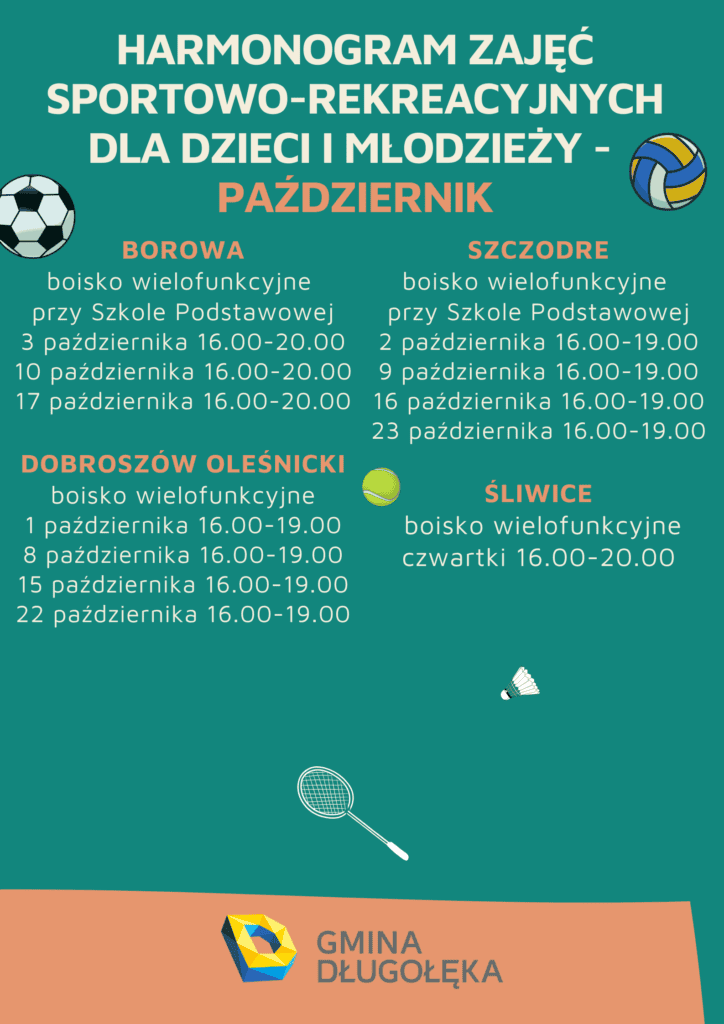 ZAJĘCIA NA BOISKACH WIELOFUNKCYJNYCH I ORLIKACH Regulamin-1Pobierz Zaproszenie do złożenia ofert na Animatorów do organizacji i przeprowadzenia zajęć sportowo-rekreacyjnych dla dzieci i młodzieży z terenu Gminy Długołęka.